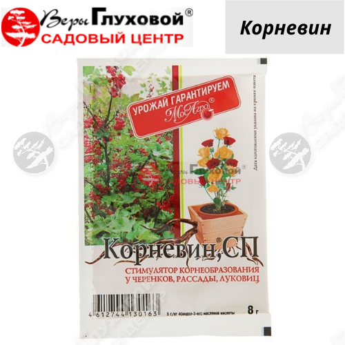 Корневин используется для укоренения черенков плодово-ягодных (сливы, вишни, черешни и др.), декоративных (роза, сирень, калина, чубушник и др.), цитрусовых культур, виноградной лозы, а также для улучшения приживаемости растений при посадке и пересадке.